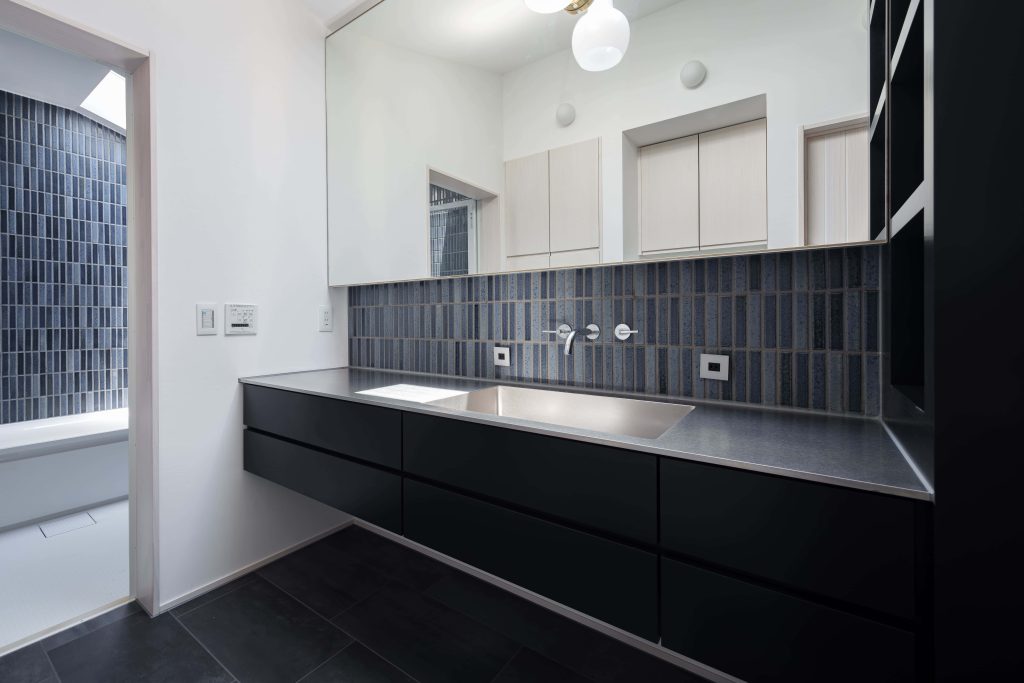 洗面のカウンターもHOMECHEFで製作。バイブレーション仕上げのステンレスですが、キッチンとは対称的に12mm厚でシャープに仕上げています。ボウルが一体になっており継ぎ目がない仕上がりに。