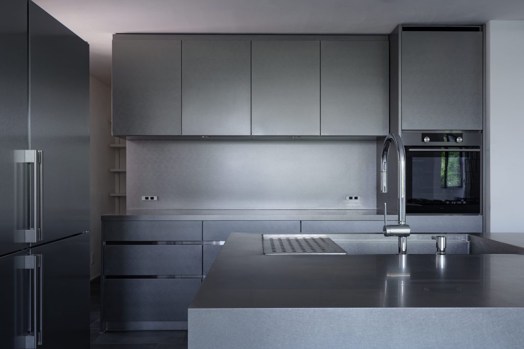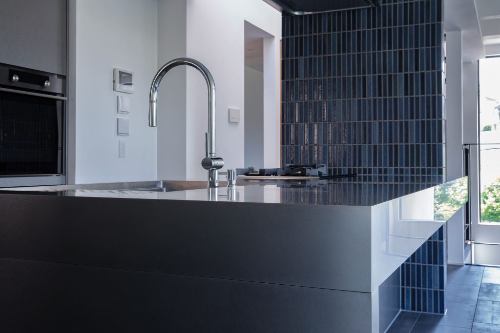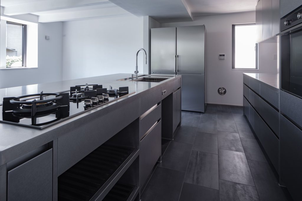 カウンターの厚みが空間にL字形を描くペニンシュラキッチンは、オールステンレスで作られています。素材の美しさを150mmの厚みのカウンターで表現しています。