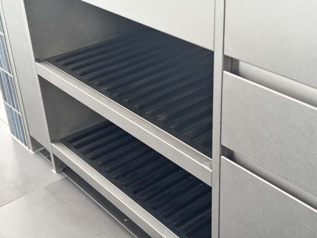 美しく見えるポイントが、ステンレスを折る際に、裏側から溝を入れることによりエッジが際立つVカット加工です。